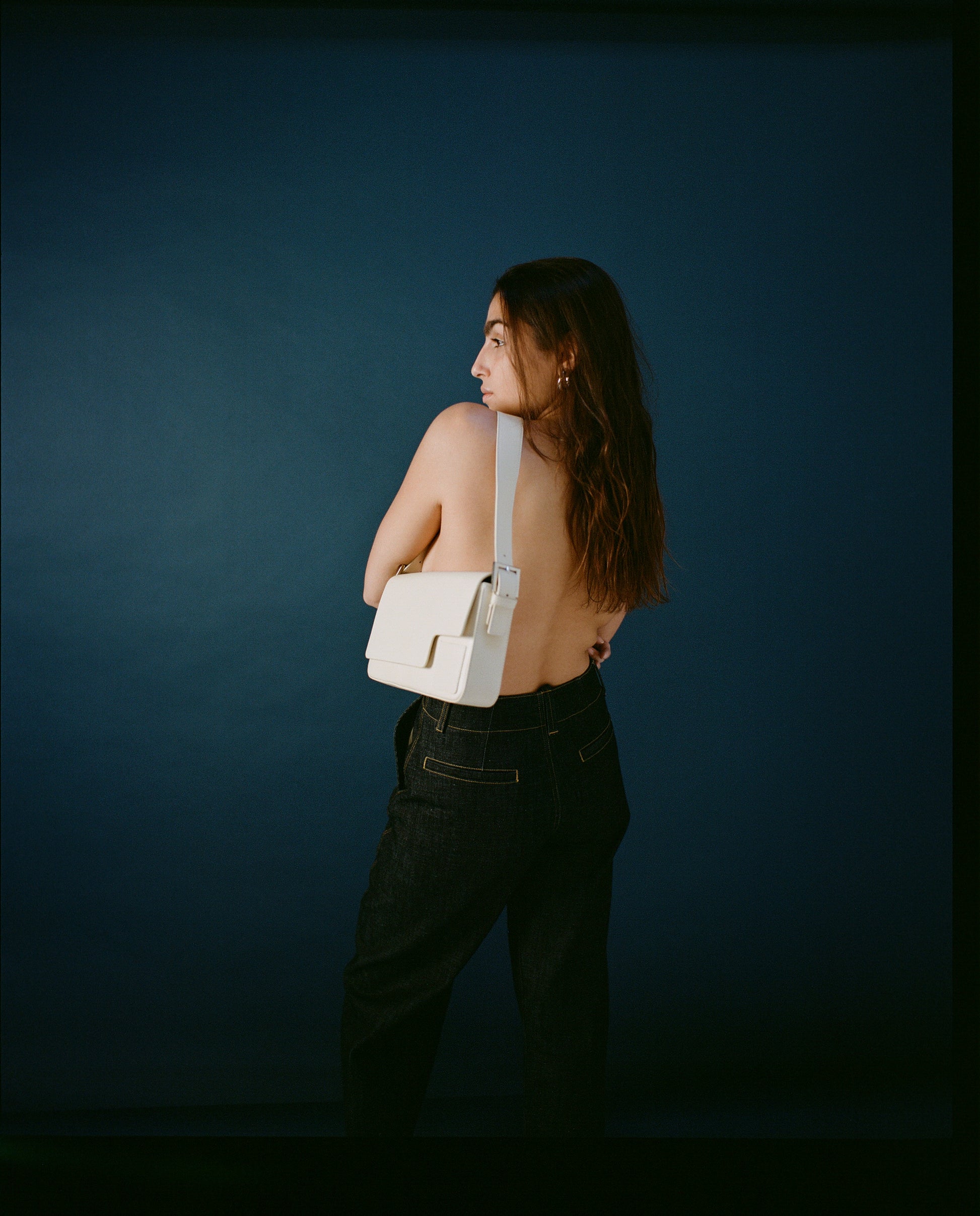 Pebbled calfskin leather shoulder bag in a “dirty white”. The bag features an adjustable shoulder strap, fold over flap with a magnetic closure, and interior leather patch logo. On the back of the bag you will find the signature initial branding embossed in the leather. The interior lining is 100% cotton-linen in beige. The hardware featured on the bag is silver-toned, for a sleek finish.