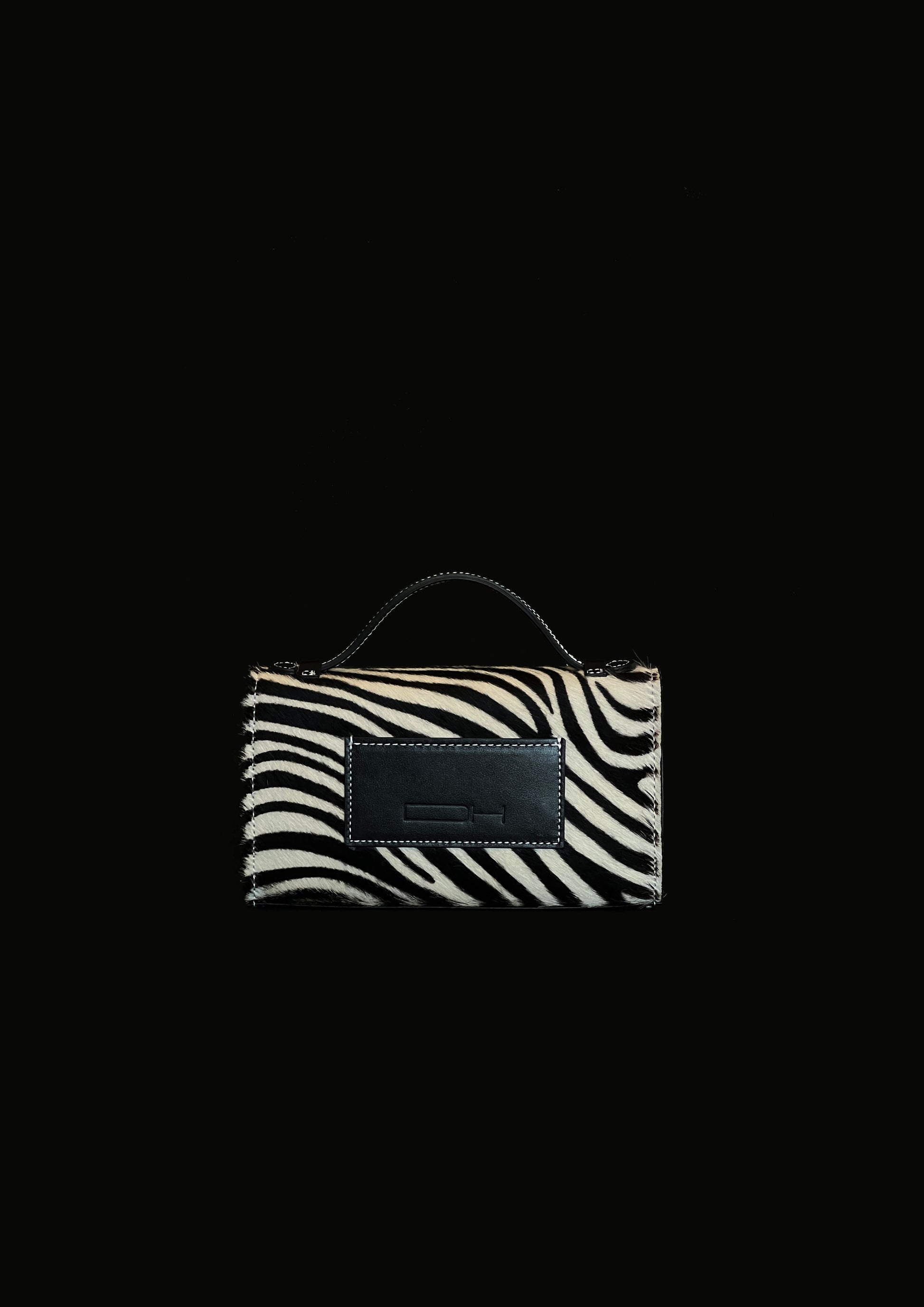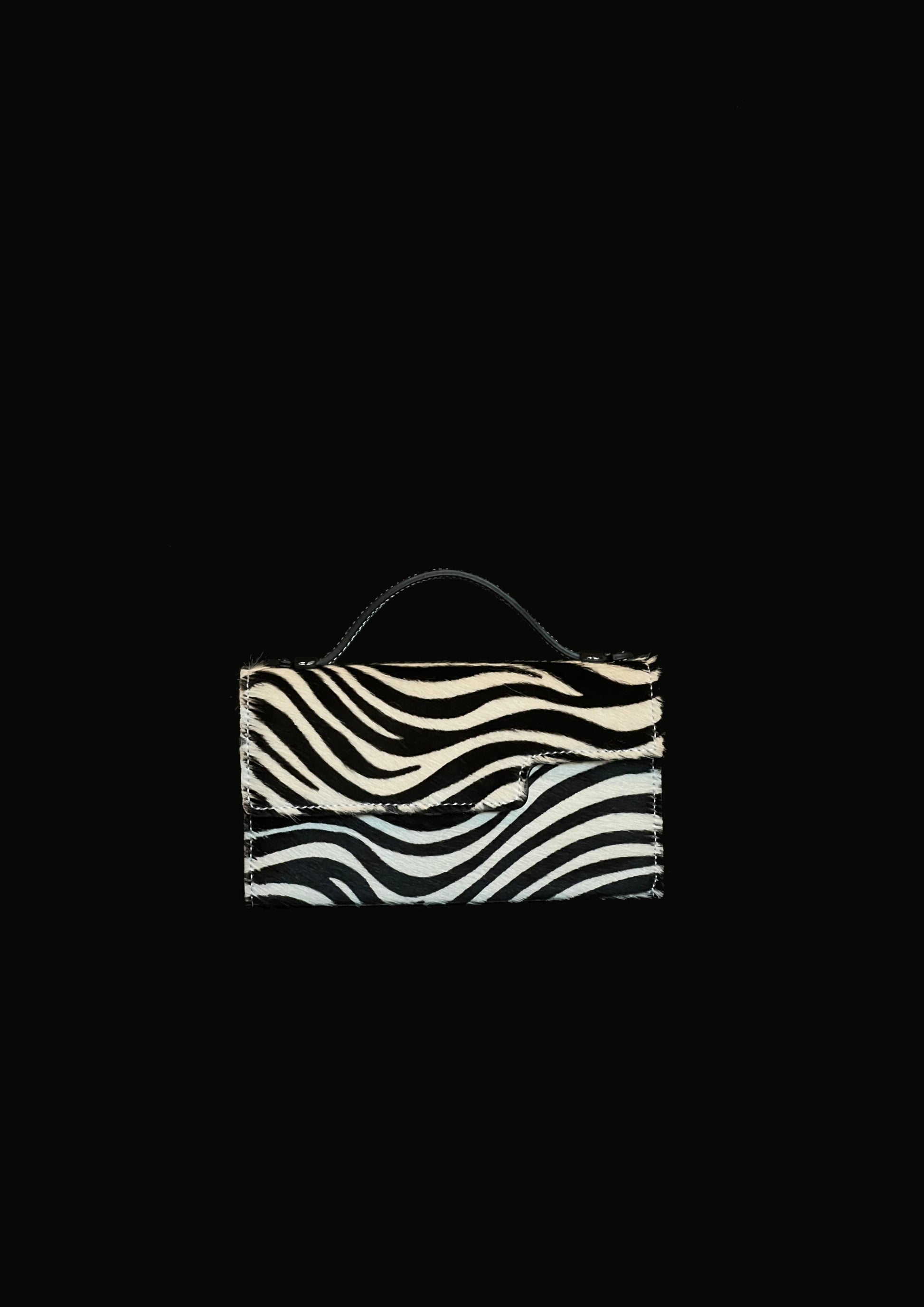 The zebra calf hair wallet on chain with smooth black leather details. The bag features a short top handle, fold over flap with a magnetic closure, and contrasting white stitching. On the back of the bag you will find the signature initial branding embossed in the leather. The interior lining is 100% satin and features eight card slots. The chain strap featured on the bag is silver-toned, for a contemporary finish.