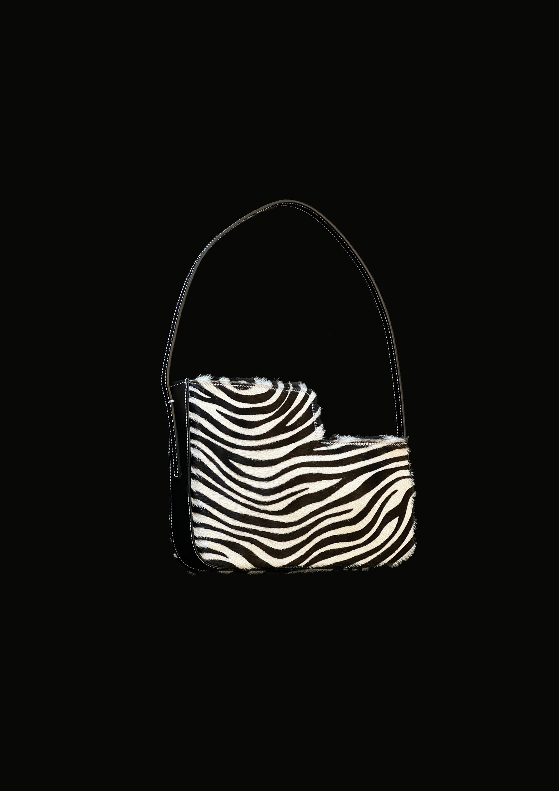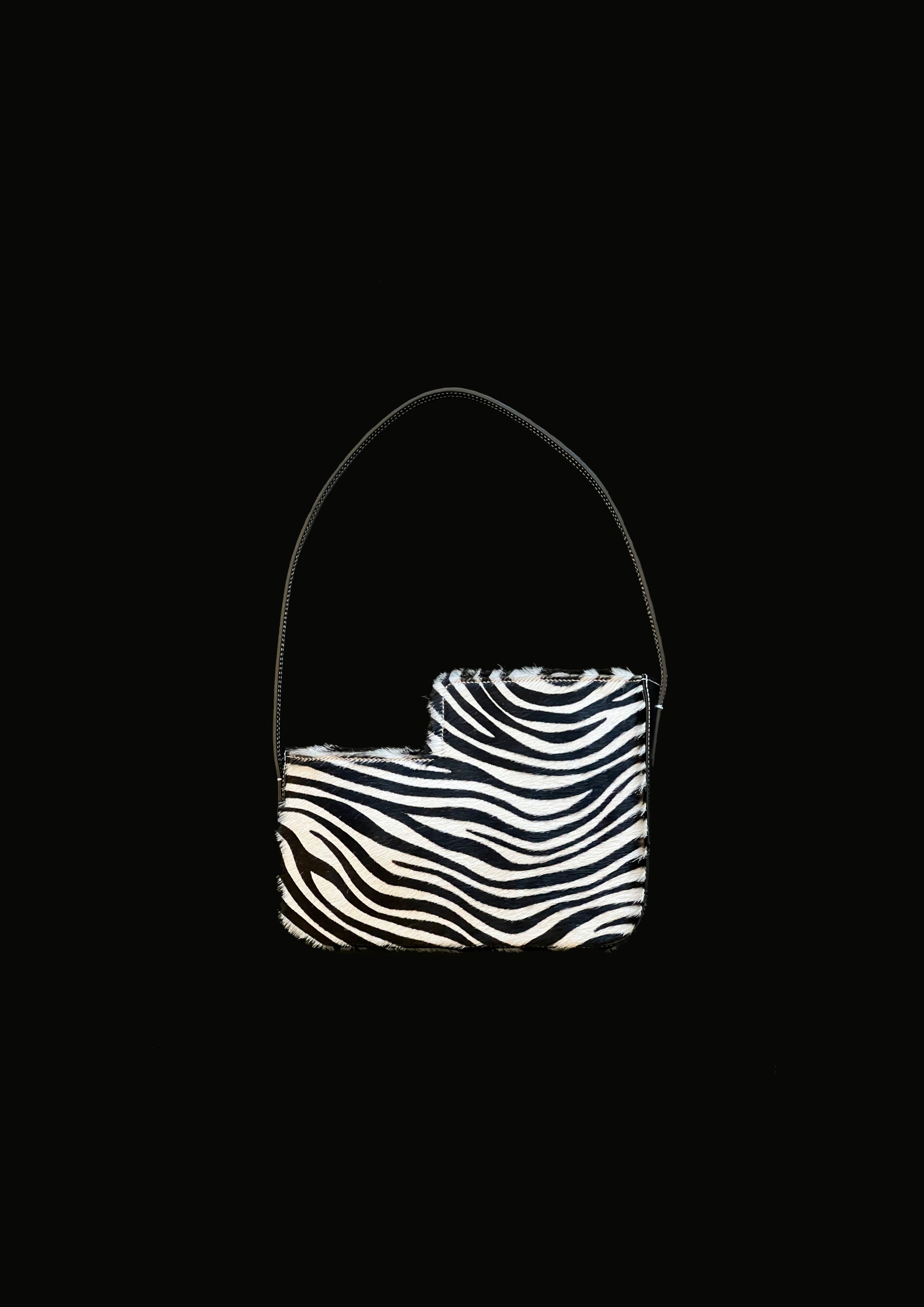 The Aalto is a small shoulder bag, that pays homage to the brand's iconic asymmetric flap. Aalto takes its name from the Finnish artist and architect, Alvar Aalto. The silhouette is inspired by Bauhaus furniture, and architecture. In zebra printed calf hair with smooth black calfskin outlines.